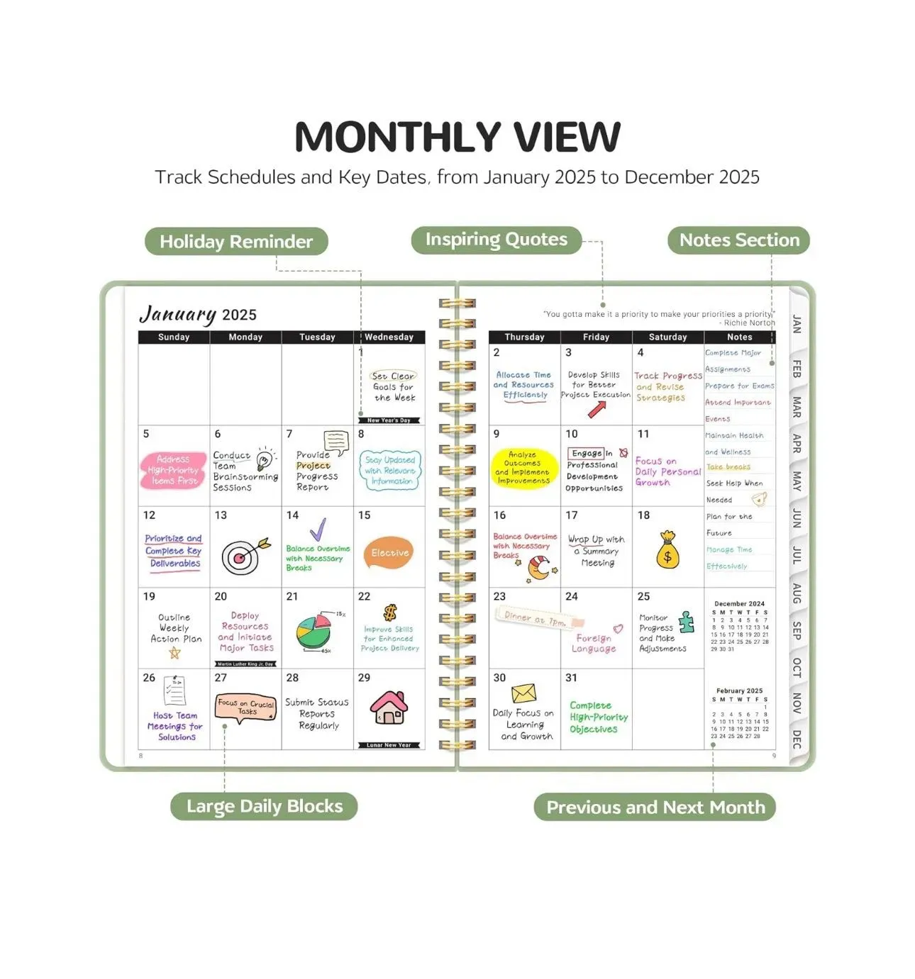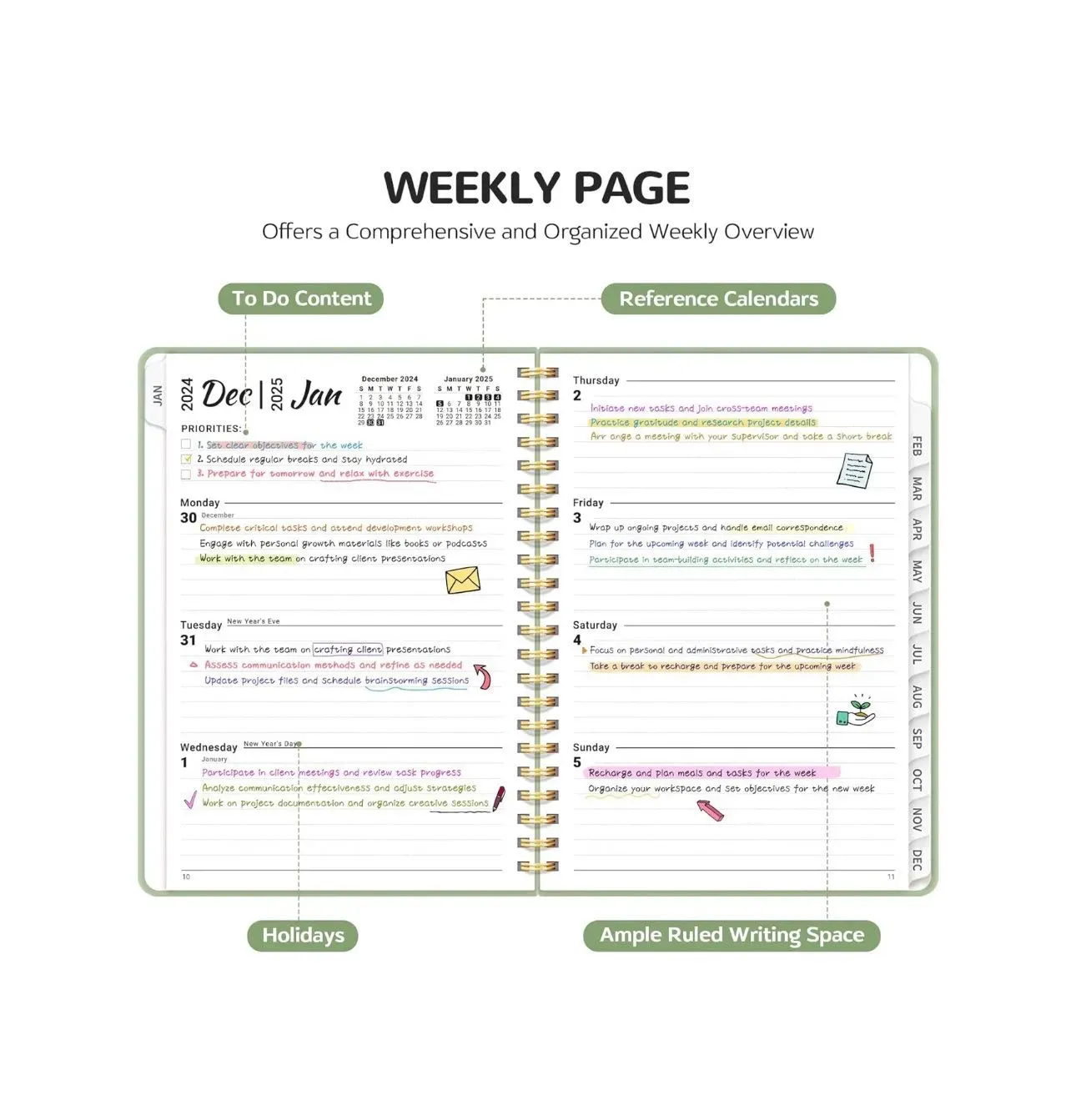 Cobertura completa: nuestra agenda 2025 cubre todo el año, de enero a diciembre, asegurando que estés preparado para cada mes y semana por delante. Con 53 semanas incluidas, tendrás mucho espacio para planificar, establecer metas y realizar un seguimiento de tu progreso hacia el éxito.